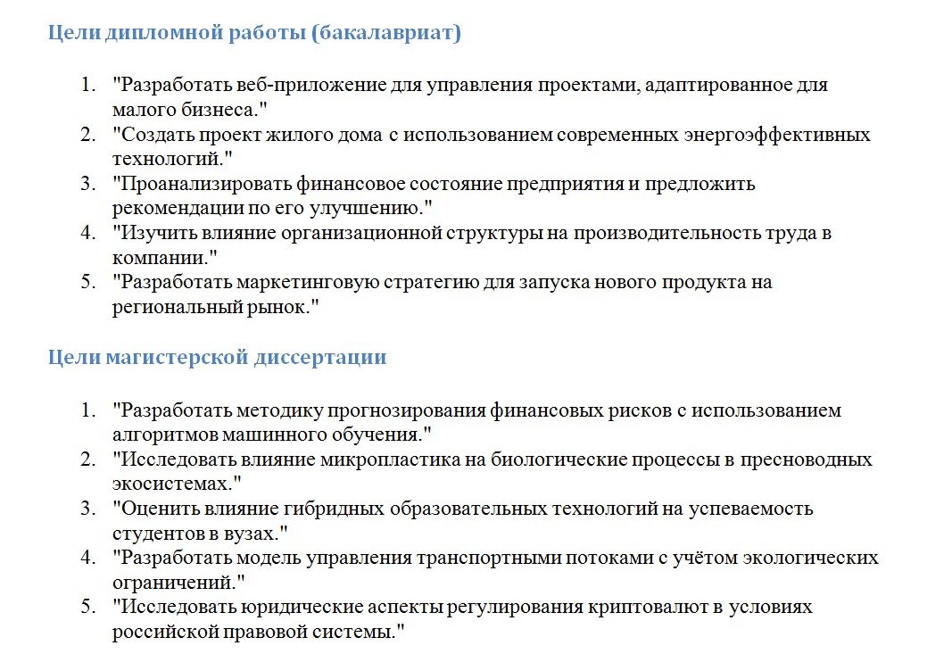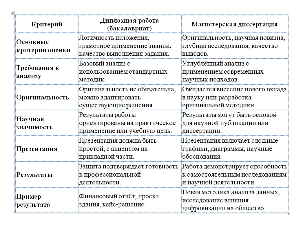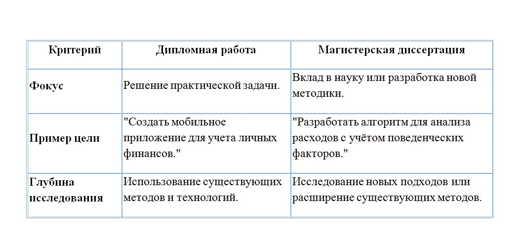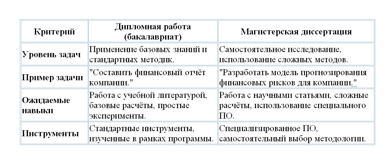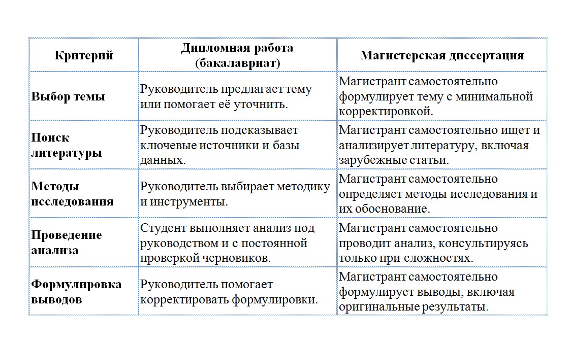 Пример: Если ты пишешь работу по биологии, в дипломе тебе хватит пересмотра существующих исследований. А в магистратуре уже нужно делать собственные лабораторные эксперименты.