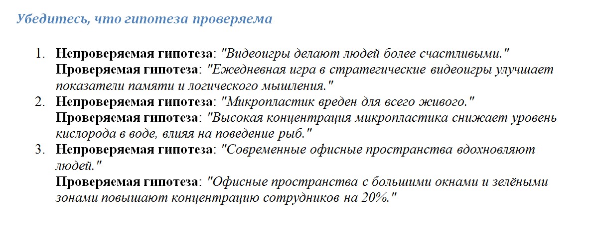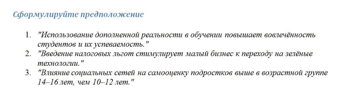 - Сформулируй конкретное предположение. "Гибкий график работы снижает уровень выгорания у сотрудников IT-компаний".