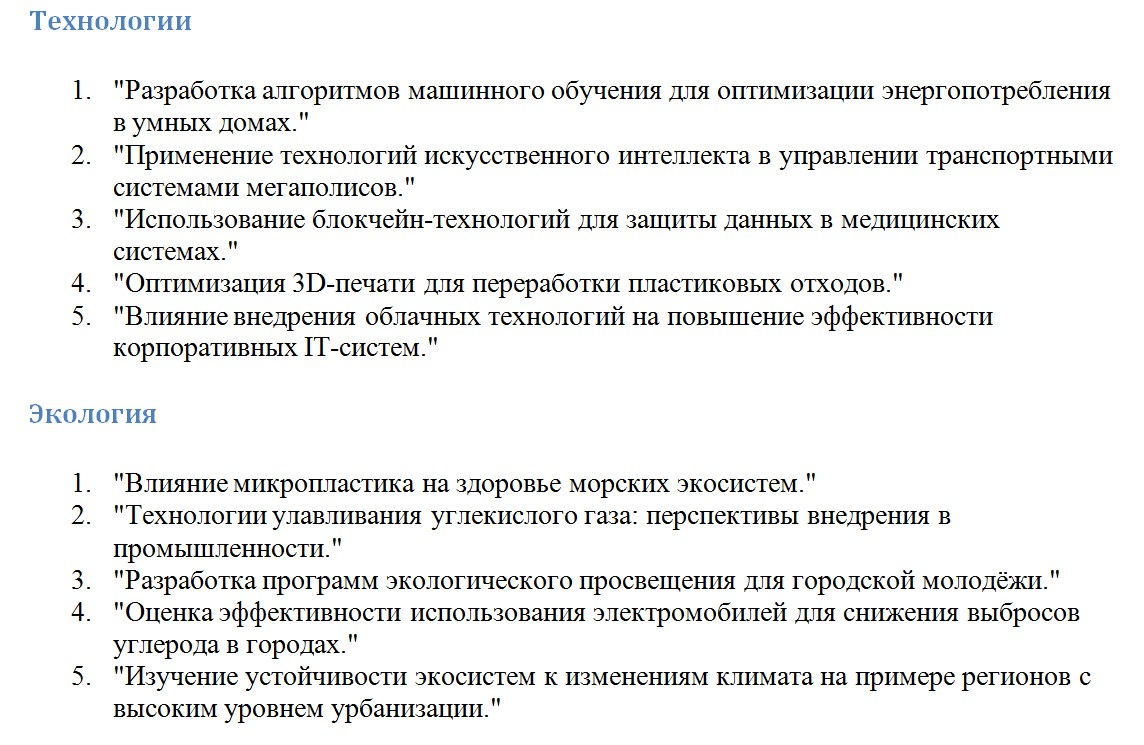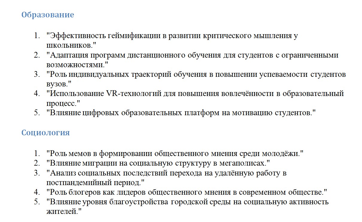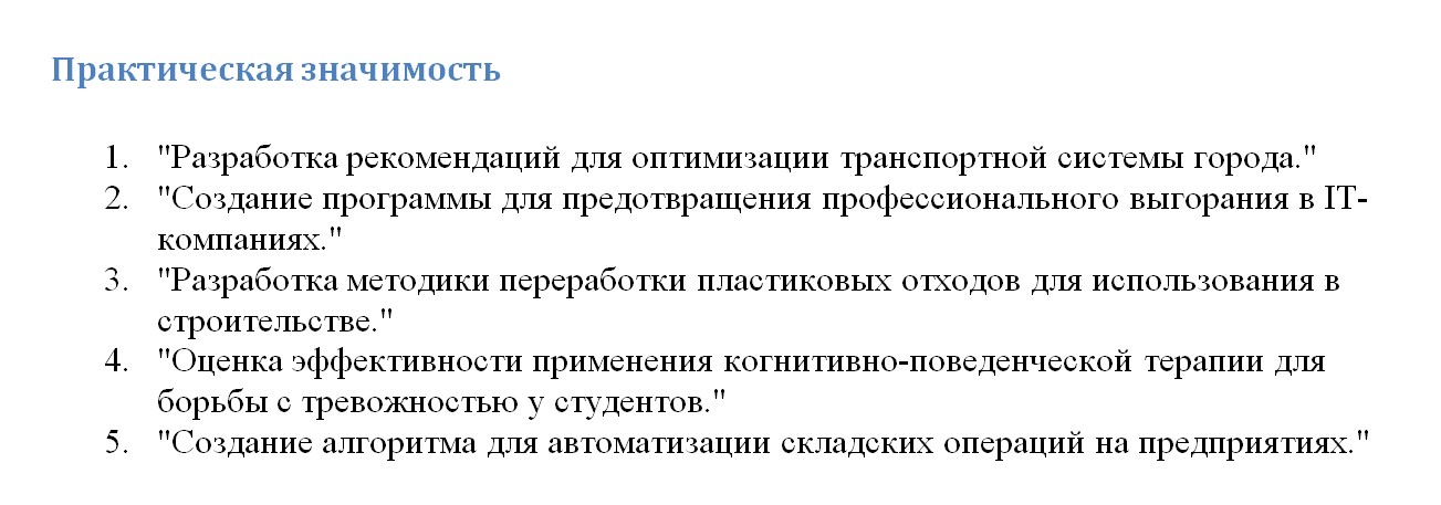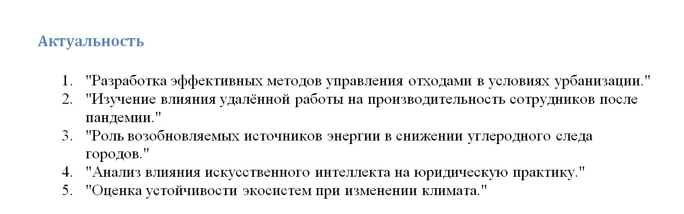 Она актуальна — тема должна касаться современных вопросов науки или практики. Например, исследования в области искусственного интеллекта, экологии, цифровой экономики сейчас особенно востребованы.
