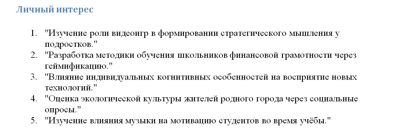 - Выпиши, что тебе реально интересно. Какие темы тебе нравятся? Что вызывает любопытство? Какие статьи или исследования ты читал с интересом? Если тема не вызывает вообще никаких эмоций, лучше поискать другую.