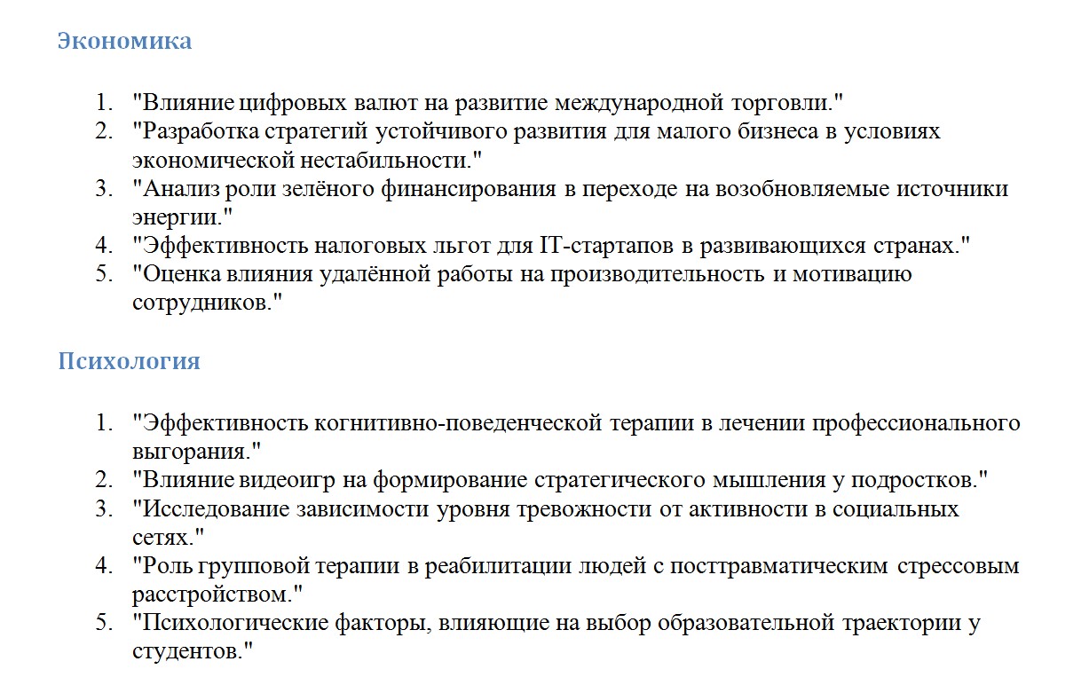- Слишком широкая тема. "Развитие мировой экономики". Ну и как ты собираешься её описать в одной работе? Тут даже 1000 страниц не хватит. Нужно сужать фокус. Например: "Влияние цифровых платформ на малый бизнес в России".