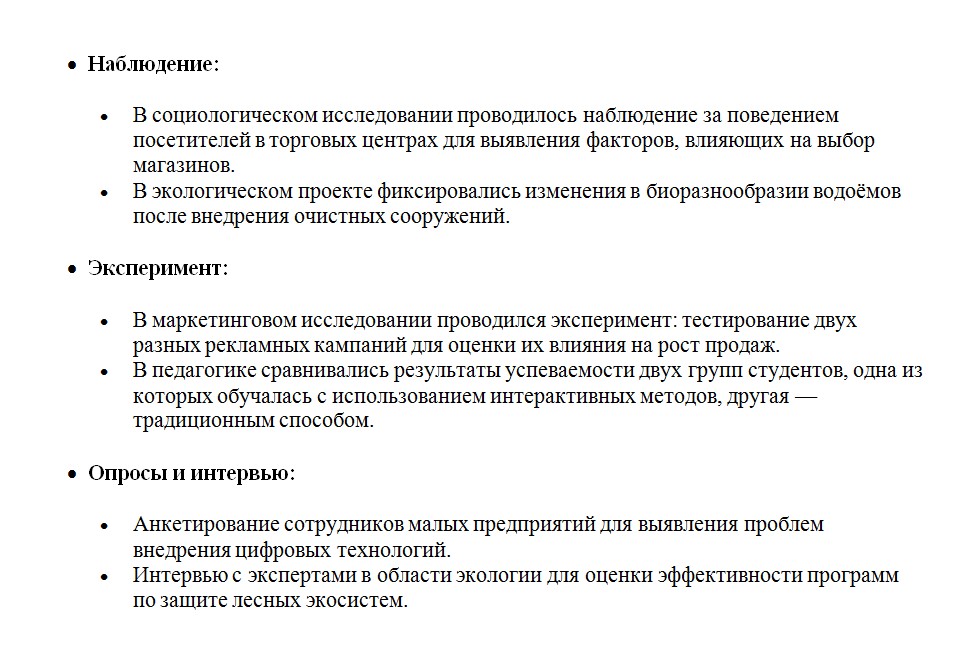 - Эмпирические — сам собираешь новые данные: опрашиваешь, наблюдаешь, экспериментируешь.