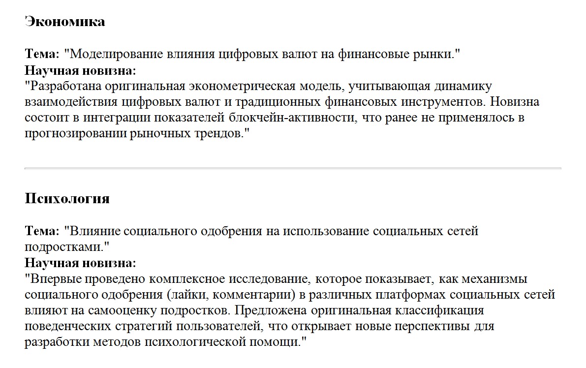 Например, если вы исследуете, как интернет влияет на психику подростков, новизна может быть в том, что никто до вас не изучал влияние конкретной соцсети. Или, если вы разрабатываете лекарство, новизной может быть новый метод синтеза, который делает его дешевле в производстве.