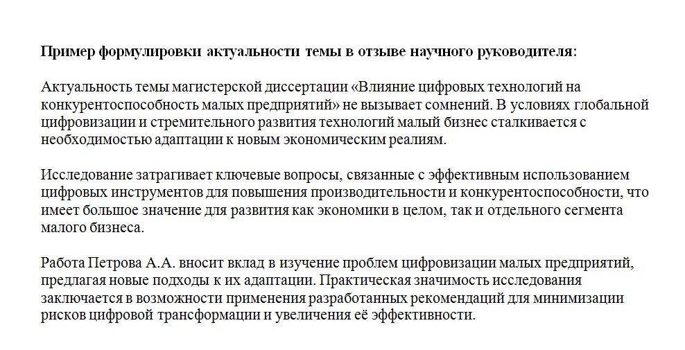 Руководитель должен объяснить, почему выбранная тема важна именно сейчас: какую проблему она затрагивает, на какой научный или практический запрос отвечает. Хорошо, если при этом будет упомянуто, чем работа отличается от уже существующих исследований: есть ли в ней новый подход, уникальные данные, практическая польза.