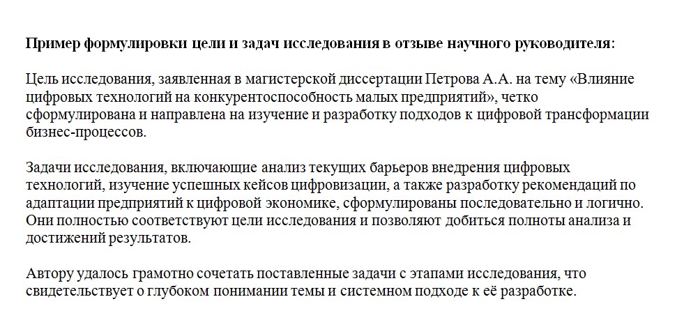 В отзыве важно показать, насколько цель исследования была конкретной, и как грамотно были сформулированы задачи. Если они были логично выстроены и в итоге решены — это сильный плюс. Здесь же можно отметить, насколько цель соответствовала содержанию работы, и не было ли «расхождений по пути».