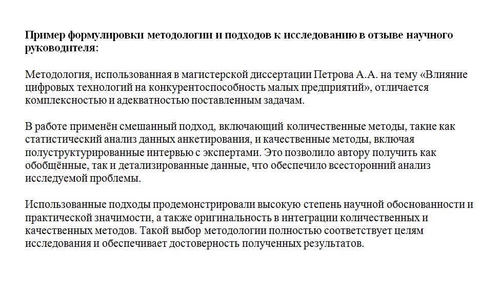 Коротко, но по существу: были ли методы адекватны теме, соответствовали ли научной логике, как они были применены. Если студент самостоятельно подобрал и обосновал подходы, это стоит подчеркнуть. Также важно указать, были ли методы типовыми или включали оригинальные элементы.