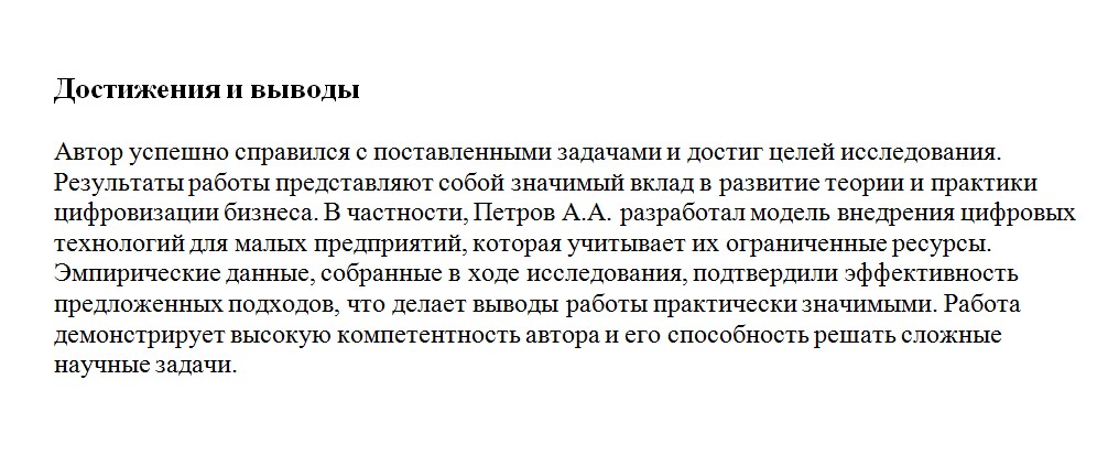 Это ключевая часть. Руководитель оценивает, насколько студент достиг заявленных целей, какие результаты получил и насколько они обоснованы. Особенно важно указать, есть ли в выводах реальная научная или практическая ценность. Если студент предлагает решения, рекомендации или новые идеи — это серьёзный плюс.