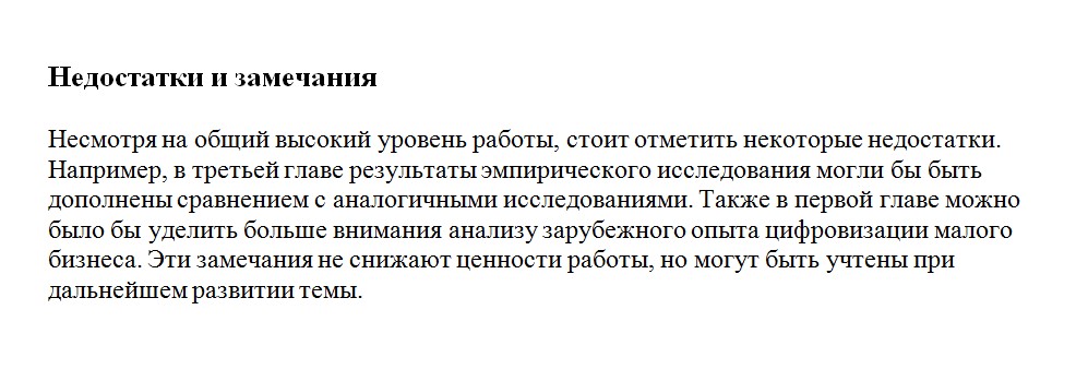 Не замалчивать проблемы, но и не рубить с плеча. Пишите по сути: «Работа содержит ряд не до конца проработанных разделов, которые требуют доработки перед защитой» или «исследование нуждается в уточнении гипотезы и повторной проверке данных». Главное — честность и корректность.