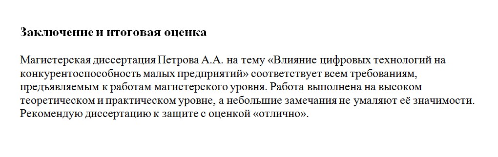 Заключение должно быть коротким и чётким. Здесь формулируется итог: соответствует ли работа требованиям, можно ли её допускать к защите, и на какую оценку она, по мнению руководителя, тянет. Если всё выполнено на высоком уровне, стандартная формулировка: «Работа выполнена на достойном уровне, рекомендуется к защите с оценкой "отлично"».