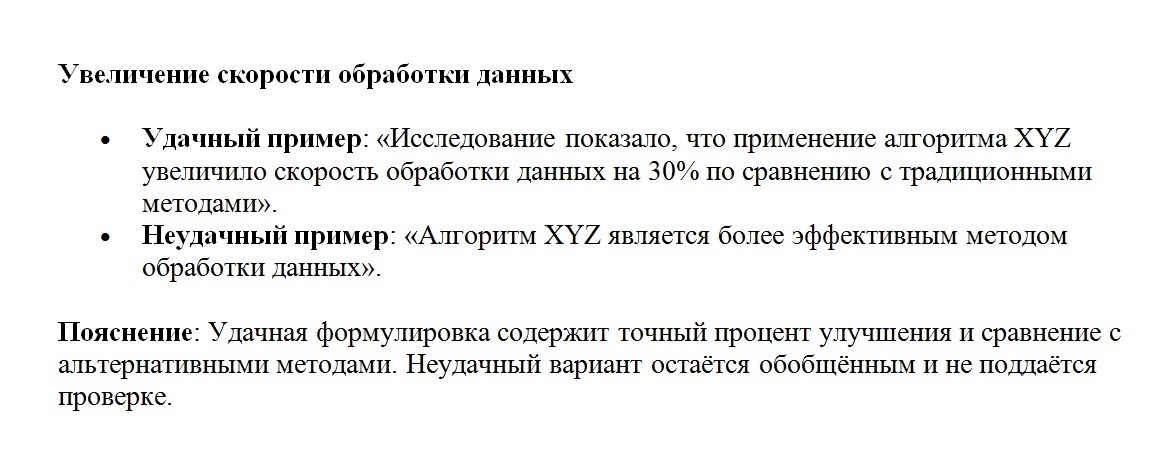 Убирай фразы типа «по нашему мнению», «достаточно эффективно», «весьма вероятно». Вставляй цифры, сравнения, таблицы, ссылки на результаты.
