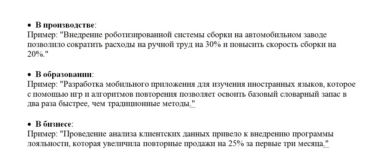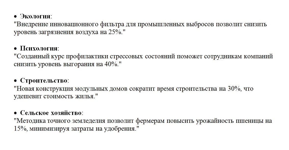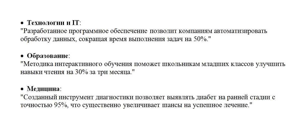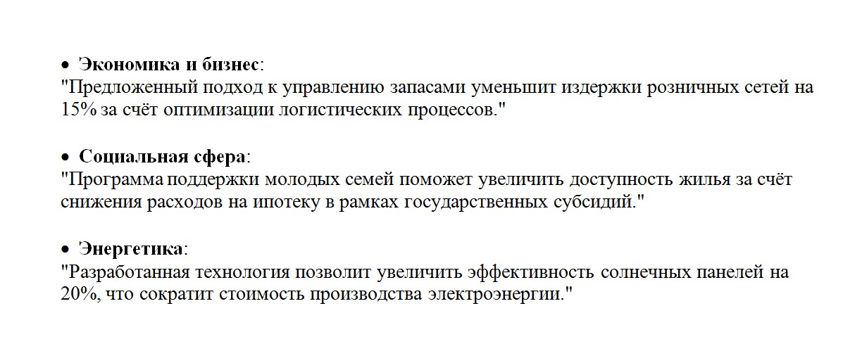 - Приведи цифры. Например, "Применение предложенной методики снижает затраты на производство на 12%."