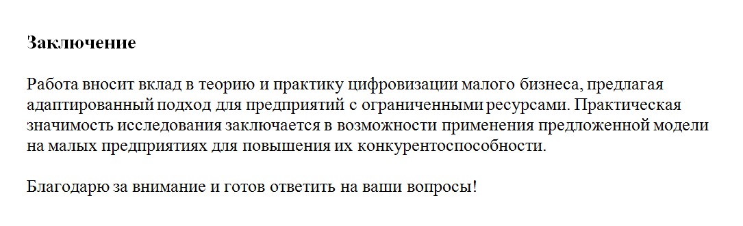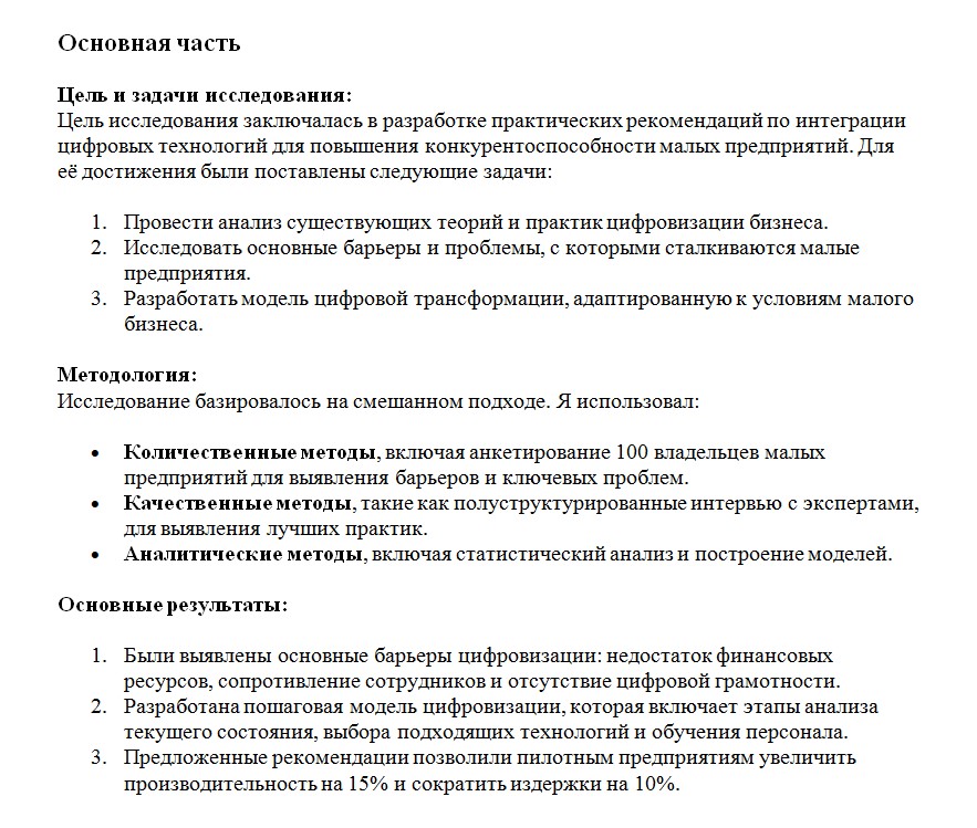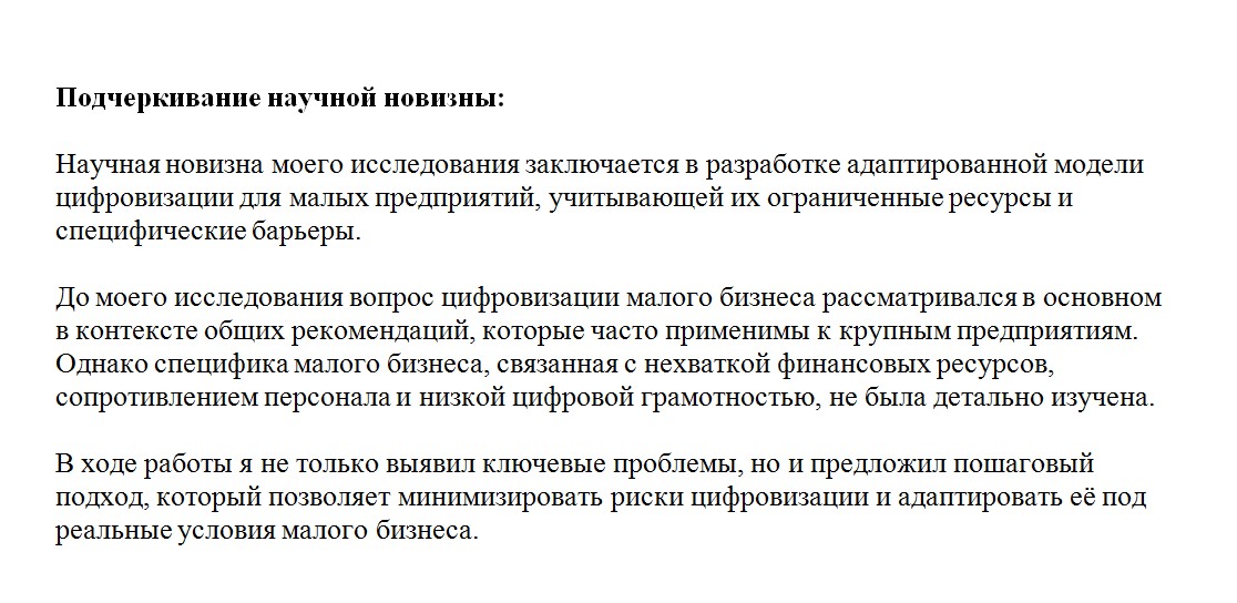 Скажи конкретно: что именно ты сделал, чего не было до тебя. Это может быть метод, объект, интерпретация, даже новый подход к известной теме. Избегай слов «значительно обогатил науку» — покажи конкретную точку отличия и зачем это нужно.
