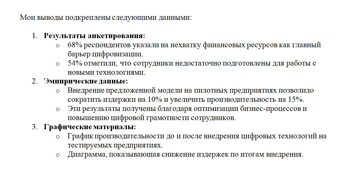 Даже если у тебя сотни таблиц, в речи достаточно 2–3 ключевых факта. Выбери самые убедительные цифры — те, что напрямую подтверждают твои выводы.