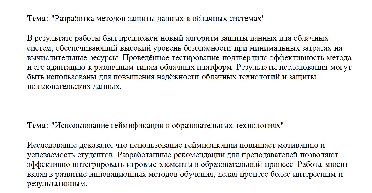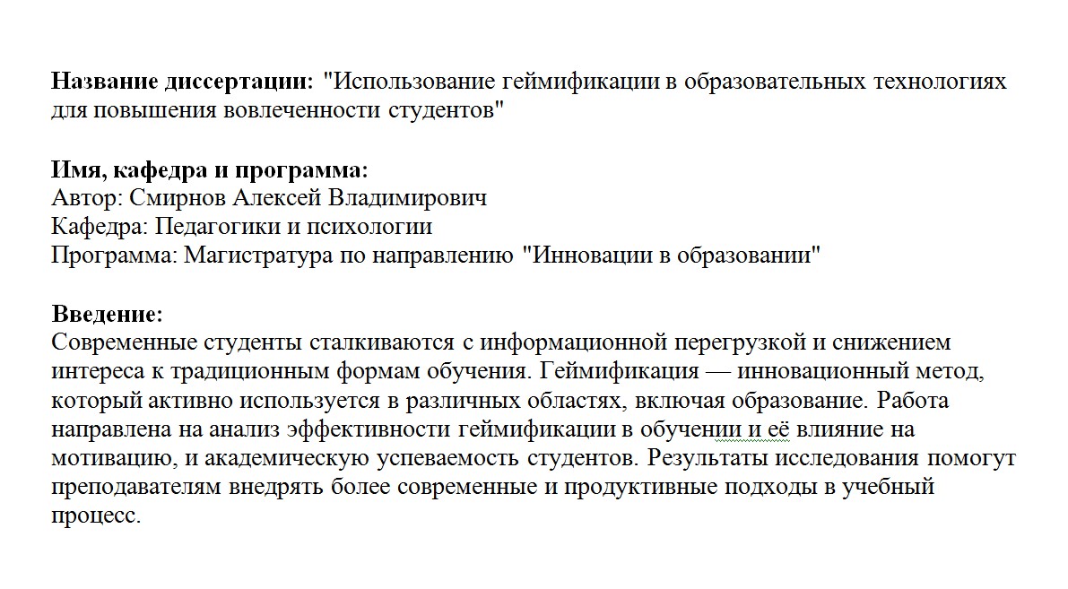 Пример: "Эта работа посвящена изучению влияния гибкого графика на продуктивность сотрудников. Рассматриваются плюсы и минусы удалённой работы и её влияние на мотивацию."