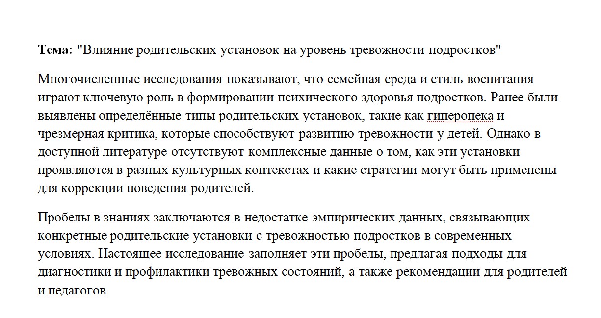 Пример: "В последнее время удалённая работа и гибкий график стали популярными, но до сих пор нет чётких данных, действительно ли это повышает продуктивность сотрудников. В моей работе я пытаюсь разобраться, так ли это на самом деле."