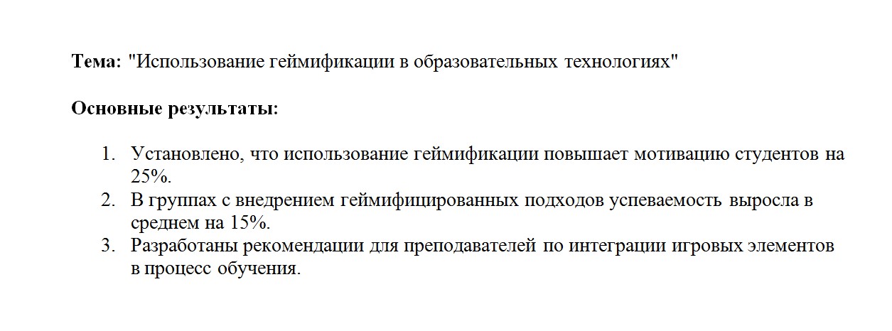 Пример: "Я выяснил, что гибкий график действительно повышает продуктивность, но только при наличии хорошей самодисциплины. Будущие исследования могут изучить, как именно работодатели могут помочь сотрудникам адаптироваться к гибкому режиму."