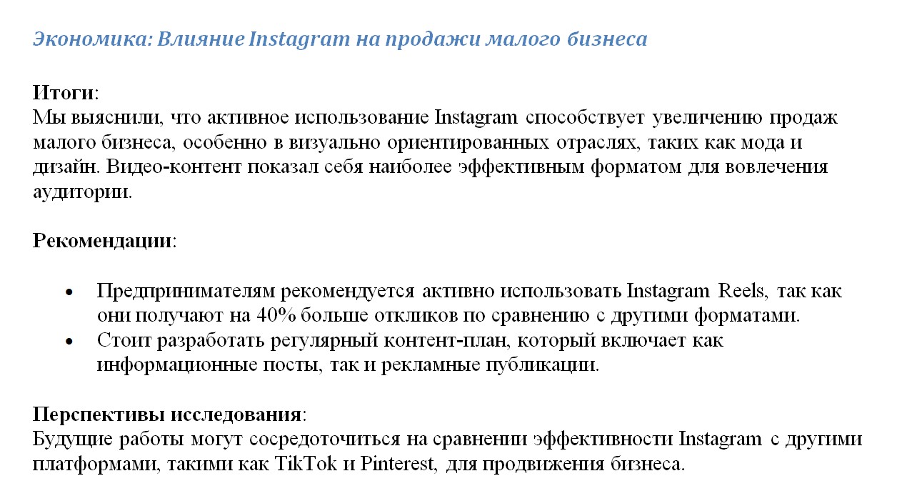 Актуальность. Почему эта тема важна? Например: «В последние годы Instagram стал важнейшим инструментом для малого бизнеса».