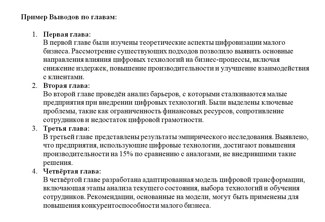 Это не значит: «в первой главе мы рассмотрели…». Лучше структурировать выводы по ключевым аспектам: теоретическая база, эмпирическая часть, анализ и результаты. В каждом — конкретные итоги. Например: «Анализ показал, что…», «Использование метода позволило выявить…», «Полученные данные подтверждают…».