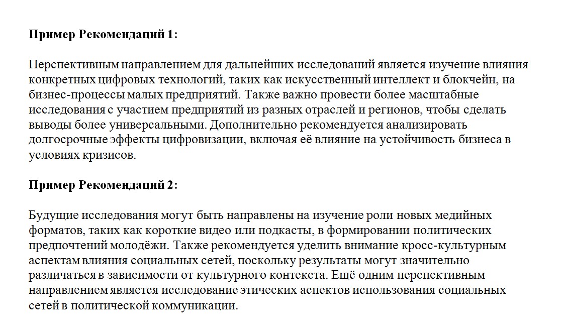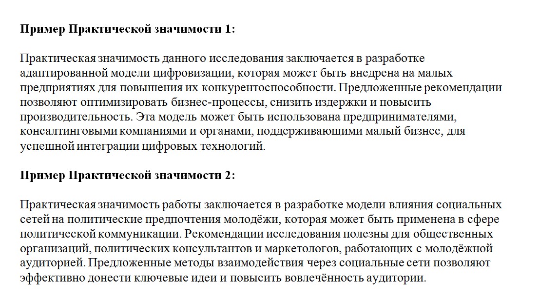 Если ваша работа имеет прикладной эффект, опишите, где её можно применить. Это могут быть рекомендации для бизнеса, образования, управления, социальной сферы — или готовые предложения, которые уже можно внедрять. Если работа чисто теоретическая, так и скажите, но можно упомянуть, что она может стать основой для прикладных исследований.