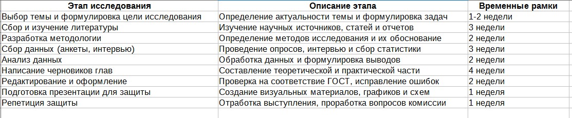 Разбейте работу на этапы. Например: «до 15 марта — окончательный план», «до 10 апреля — готова теоретическая часть», «до 1 мая — анализ», «до 15 мая — первая версия текста». Не откладывайте: каждая просрочка потом ударит по времени на подготовку к защите.